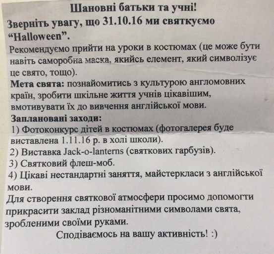 Этот заботливый отец и другие родители не могли понять, почему администрация школы приглашает детей на мероприятие, приуроченное такому празднику как Хэллоуин? Как посвящённого христианина нашего брата беспокоил вопрос: должны ли родители  пускать своих детей на подобное мероприятие, даже если это официальная программа школы? Какие могут быть духовные последствия для детей и родителей? Да и существует ли здесь опасность вообще? Наш разговор был коротким. Мне не пришлось долго объяснять, потому что человек, с которым я общался, сам много понимал в духовных вопросах и всего лишь хотел убедиться в правильности своих пониманий и возмущений. Но после нашего разговора у меня появилось побуждение написать короткое наставление всем родителям относительно этого «нового» для Украины праздника и соответствующей новой моды, когда  школьные учителя и преподаватели ВУЗов навязывают детям «современную культуру англоязычных стран». Я знаю, что сейчас благодаря Интернету можно найти много информации – положительных и отрицательных отзывов об этом празднике. Но все же, как разобраться христианину во всем этом, ведь многие родители в суете не придают значения некоторым вещам, дескать: «если это от школы, что плохого может быть в этом?»